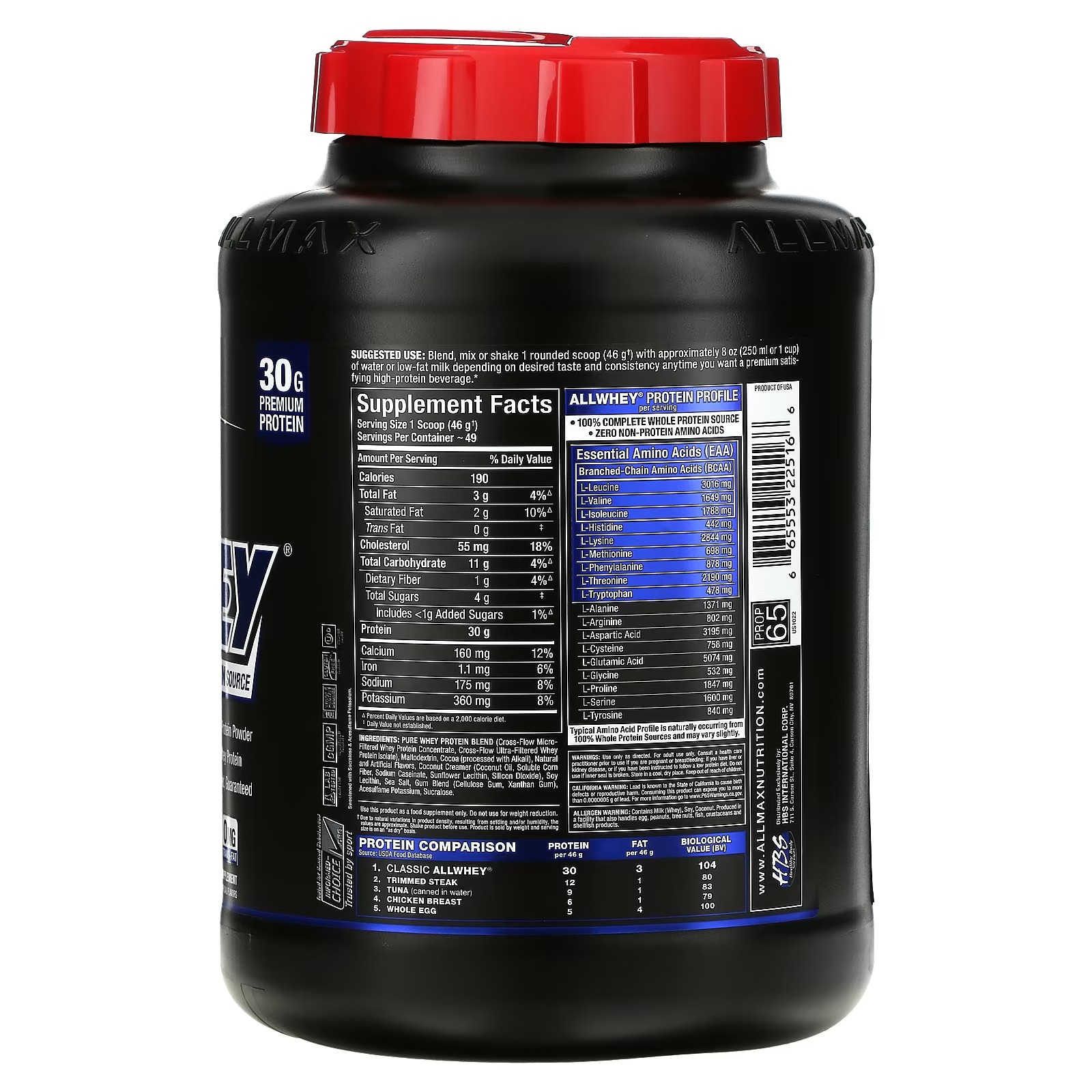 CLASSIC ALLWHEY® is a premium Whey Protein Concentrate blended with Whey Protein Isolate delivering 30 g Protein in a 46 g serving, tested and guaranteed! ALLWHEY delivers a clean, complete and whole protein made from the best source; 100% Whey Protein!